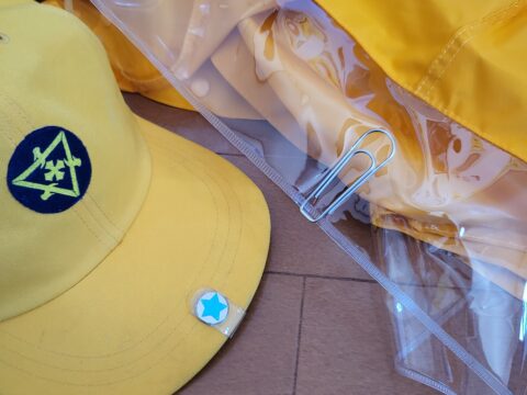 小学生の子が雨の日カッパを着た時にカッパの帽子が風で飛ばないように、学校の帽子に磁石、カッパの帽子にクリップを取り付け、...