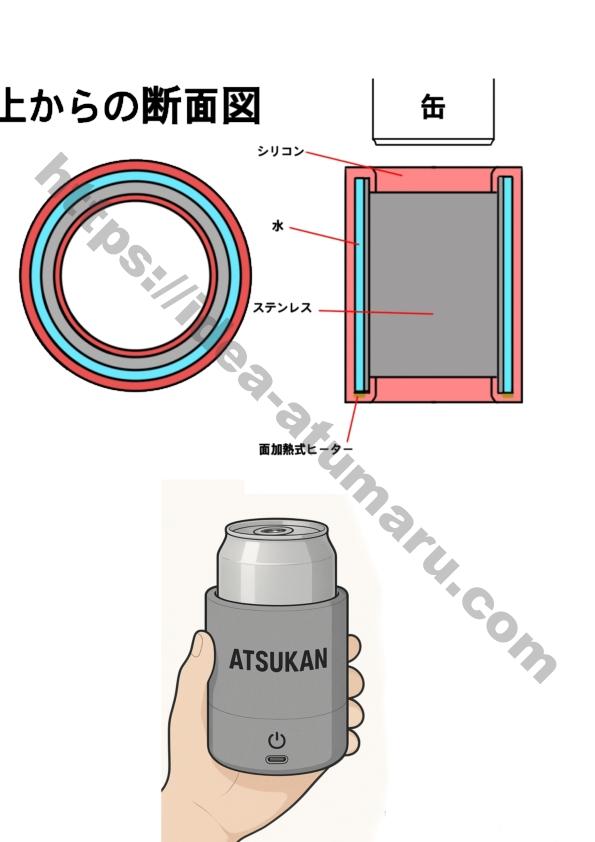 携帯型 缶飲料30秒加熱デバイス「ATSUKAN(熱缶・圧巻)」 アイデアID: 12902 家電・機器 投稿日:2025.12.22 冷たい缶が約30秒で飲み頃(最大50℃)になる携帯型デバイス案です。 玉川 智史