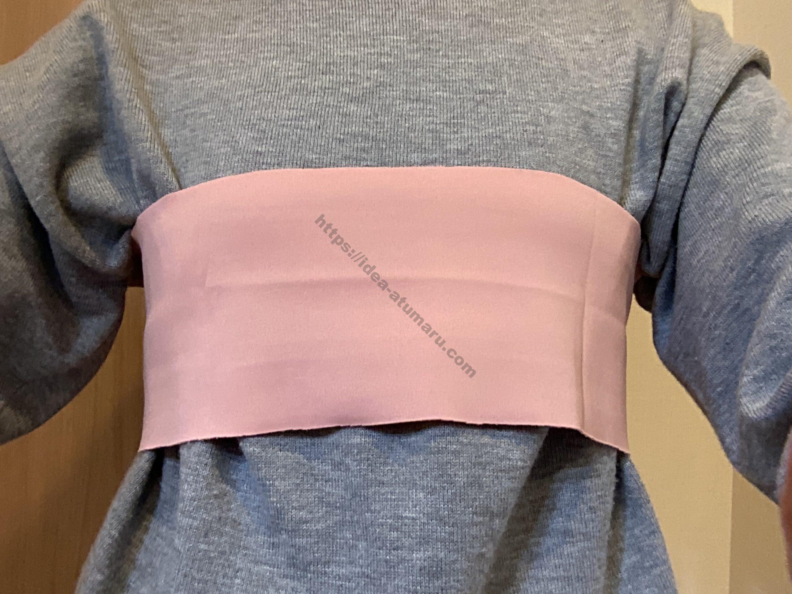 毎朝の洗顔時に、胸元に水が飛び散って困っていました。切りっぱなしOKのジャージータイプの生地で胸に巻くバンドを作ってみま...