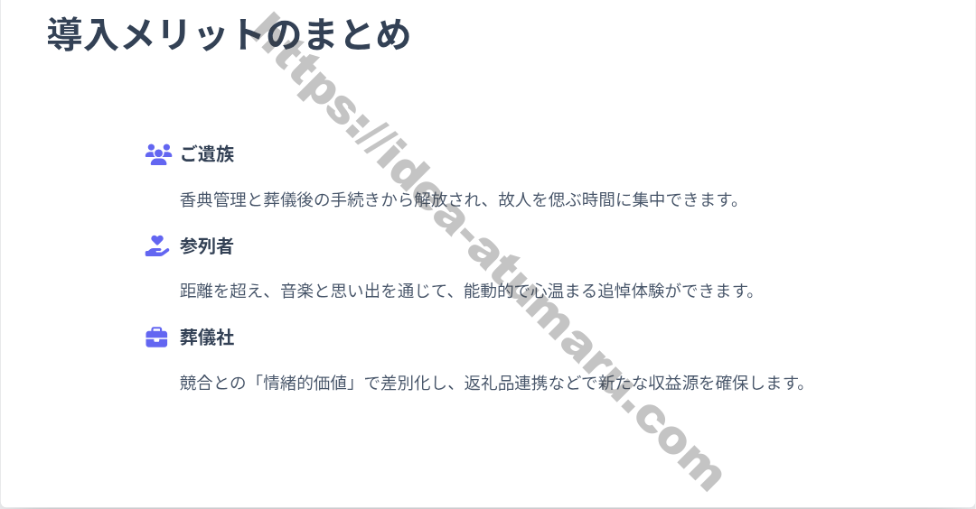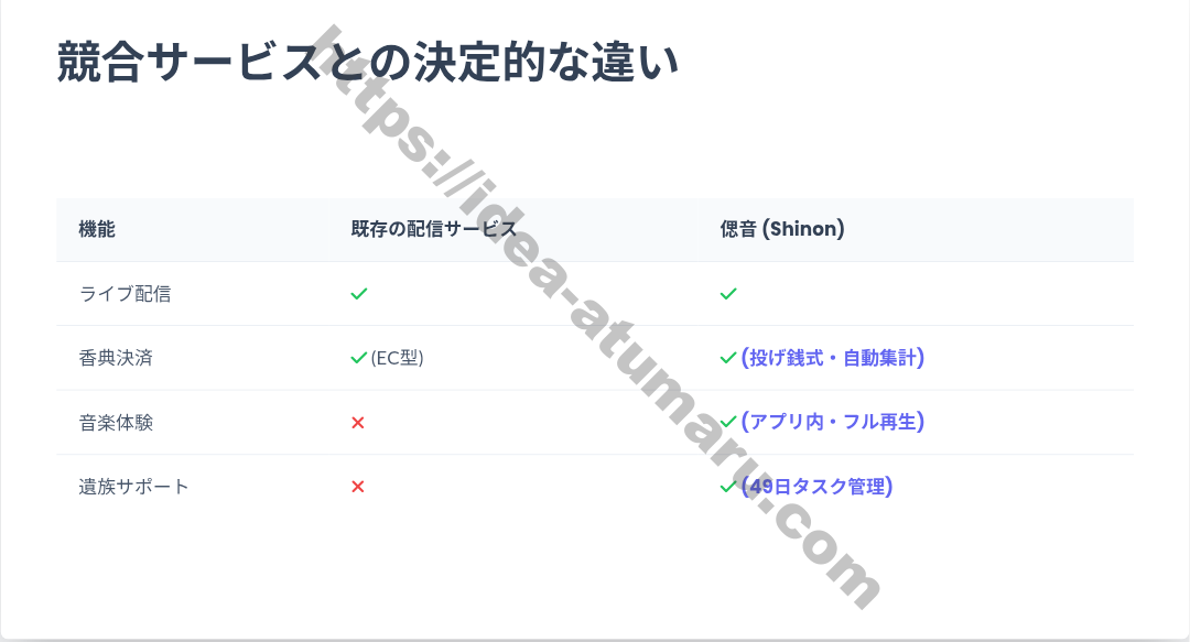 香典は投げ銭式!故人の音楽で偲ぶオンライン葬儀アプリ「偲音」 アイデアID: 12545 プログラム・ソフトウェア 投稿日:2025.11.20 遠方でも心を込めて弔えるオンライン追悼プラットフォームです。 主要な機能 1.投げ銭スタイルの香典 キャッシュレス決済... 千万城